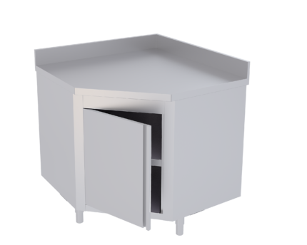 SS 304 AISI Corner base cabinet with 1-hinged door and middle shelf and 2-side back splash and adjustable legs